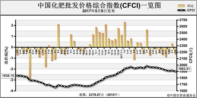 化肥批发价格综合指数(CFCI)为1903.51点,环比跌12.61点,跌幅0.66%;同比涨65.36点,涨幅3.56%。