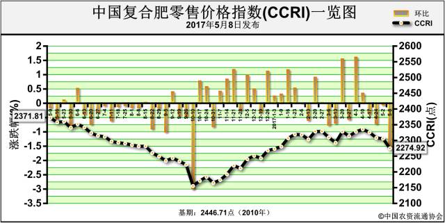 复合肥零售价格指数(CCRI)为2274.92点,环比跌36.65点,跌幅1.59%;同比跌96.89点,跌幅4.09%。