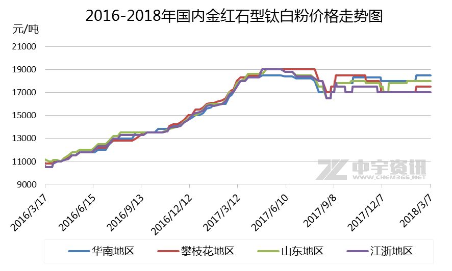 在供给侧改革的方针指导下,钛白粉产能得以优化,部分落后产能退出,钛白粉价格从2016年走出低谷期,进入上升期。2018年1月份以来钛白粉从未停止其“傲娇”属性,已经累计发布三十多个调价函。3月份以来有攀枝花兴中钛业、金浦钛业、云南大互通、山东金海钛业、广西德天化工先后发布涨价通告。
