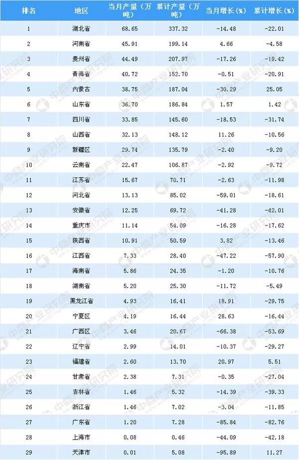 从增速来看:2018年5月农用氮磷钾化肥产量累计增速最快的是宁夏,2018年5月宁夏农用氮磷钾化肥产量达4.19万吨,同比增长28.63%。其次为福建省,福建农用氮磷钾化肥产量增速为20.97%。
