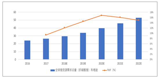 国内外动力锂电池领域对锂资源需求量(折碳酸锂)和增速
