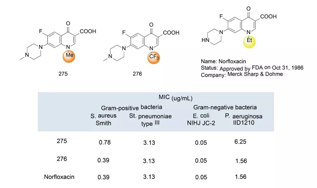 N-三氟甲基取代胺可以调节分子碱性,从而影响分子的药物动力学性质,经常被用在药物设计中。日本杏林制药公司根据广谱抗菌药诺氟沙星(Norfloxacin)的构效关系,用三氟甲基、甲基替代乙基,得到其类似物275、276,并检测其体外抗菌活性。结果表明,类似物276与诺氟沙星的抗菌能力相当。(J. Med. Chem. 2005, 48, 3443−3446.)