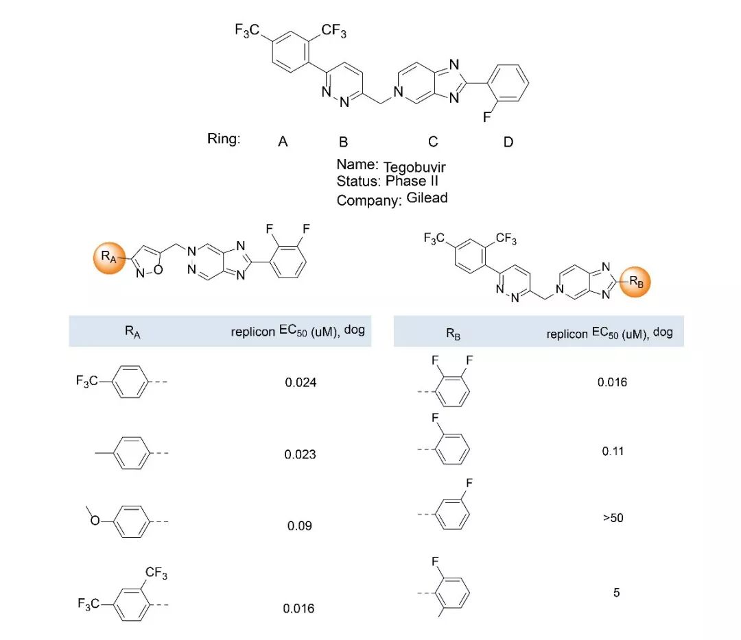 2014年,葛兰素史克(GlaxoSmithKline)公司的Martin等在J. Med. Chem上发表了对丙肝病毒(HCV)NS5B抑制剂Tegobuvir的优化过程,其中,A环和D环的均引入含氟基团。对比数据说明,苯环上氟的取代位置对药物的抗病毒效用影响大。(J. Med. Chem. 2014, 57, 1964−1975.)