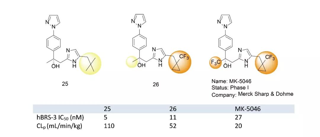 默克公司在开发用于治疗肥胖症的hBRS-3受体激动剂MK-5046过程中,将分子中的叔丁基替换成三氟甲基环丙烷结构,将-CH3替换成-CF3,增强了药物分子的亲脂性以及代谢稳定性。(ACS Med. Chem.Lett. 2011, 2, 43−47. )
