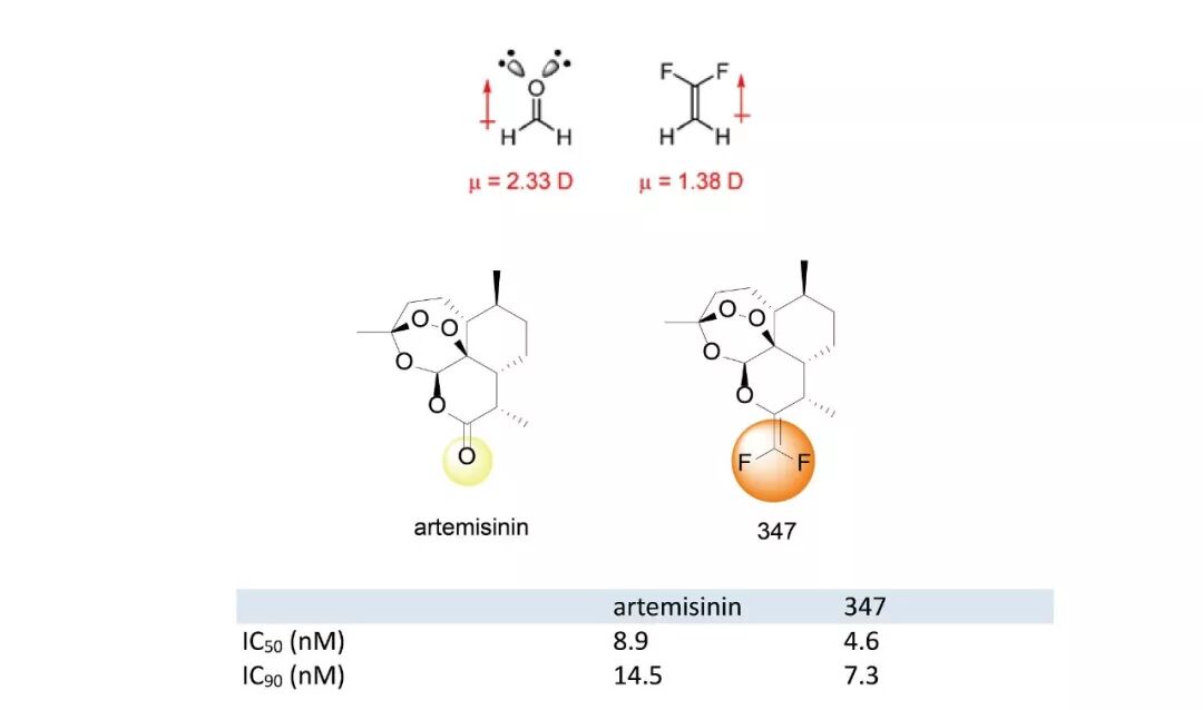法国国家科研中心的Magueur G团队将青蒿素的羰基用1,1-二氟乙烯基替代得到化合物347,使药效活性提高近两倍。(J. Fluorine Chem. 2006, 127, 637−642.)