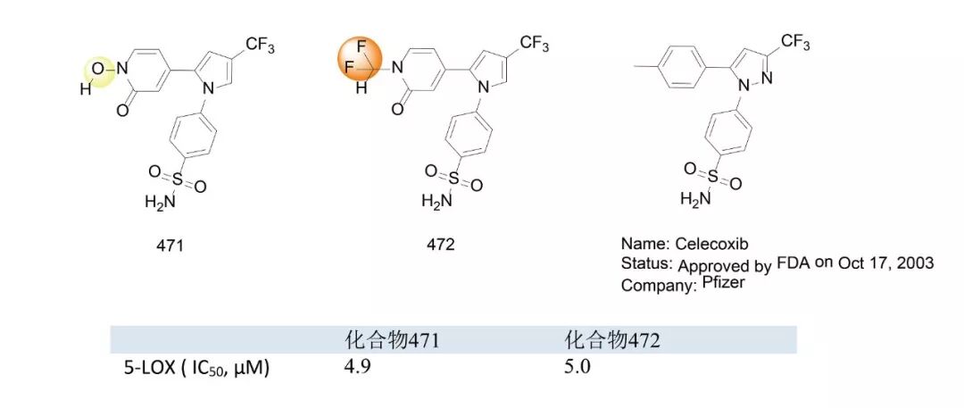 阿尔伯塔大学的Edward E. Knaus课题组以环氧化酶(COX-2)抑制剂——Celecoxib为先导化合物,设计合成了环氧酶与5-脂氧合酶的双重抑制剂471。用OH替代CHF2,得到抑制活性相近的化合物472。(J. Med. Chem. 2009, 52,1525−1529.)