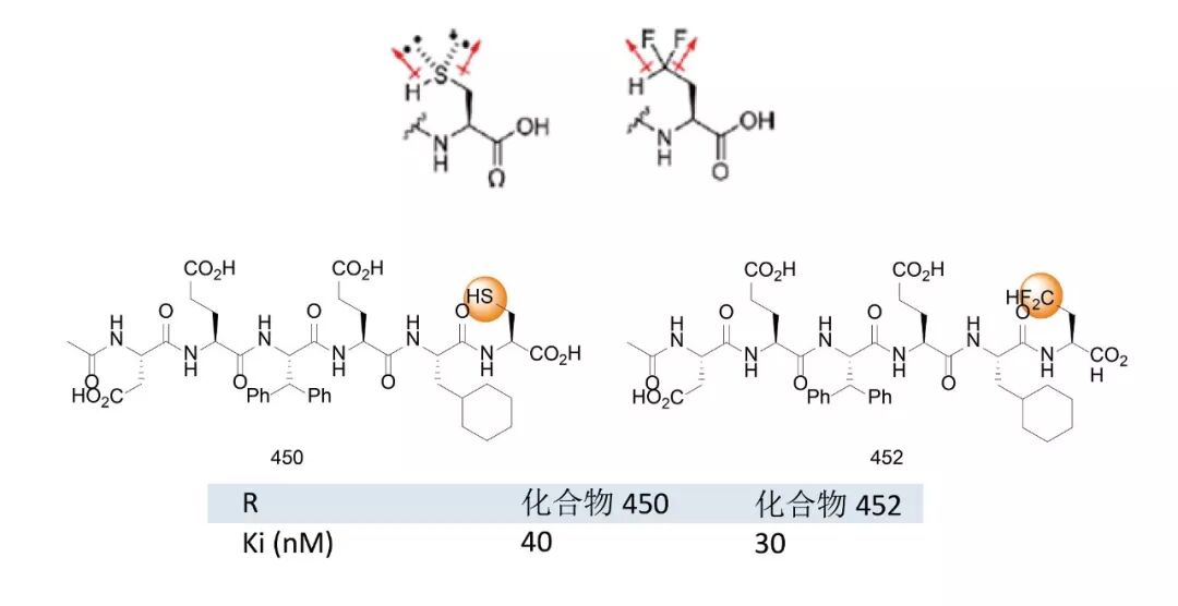 IRBM.MRL Rome公司的Frank Narjes等在开发丙型肝炎病毒NS3抑制剂过程中,将化合物450中的SH用立体结构相似CHF2替换,得到抑制活性增强的化合物452。(Bioorg. Med. Chem. Lett. 2002, 12, 701−704)