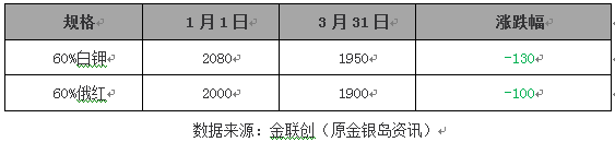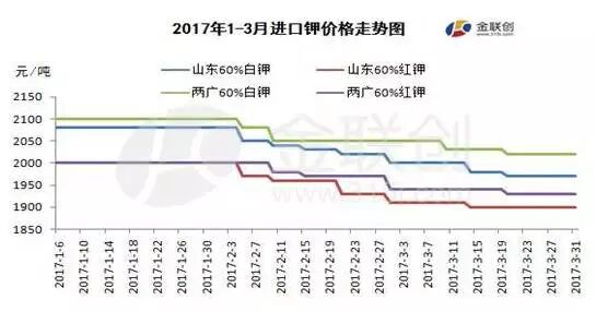 由上图可以看出,氯化钾价格自2月份开始明显下滑,虽然春节过后业者陆续返市,但复合肥工厂前期库存较多,工厂并不急于生产,需求原料有限,导致原料备肥不温不火,厂家实行随用随采原则,大单成交较少,导致钾肥市场心态不稳,氯化钾价格一直处于下行状态。2017年初,进口60%白钾成交价格基本维持在2080-2100元/吨。而截止3月底,60^%白钾已经成交在1930-1950元/吨附近,整体跌幅在130元/吨。